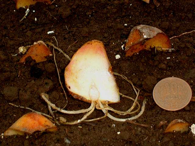 全島避難の日、3ヶだけ持ち出したユリ「島の光」の球根の鱗片を11月にバラバラに剥がし、湿らせたバーミュキュライトにまぜてビニール袋にいれておいた。1月になって1〜2ミリの小球根が鱗片の基部に発生。2月には5ミリ位になり、根も発生、今日鱗片と共に土に植えた。花が咲くまで3年位、立派な切花が切れるまでに5年位かかる。 |