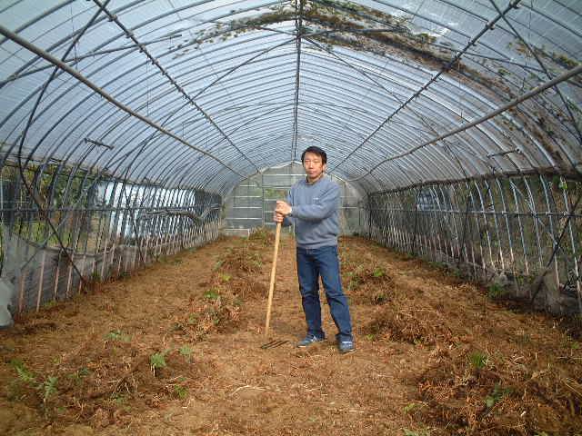 ここは、もう一人の提供者K.Yさんからお借りしているハウス一棟60坪。前作にレザーファンが植わっているので、鍬で株を掘り起こす。久しぶりの肉体労働でくたびれるが、土をさわる仕事は気分が落ち着く。K.Yさんは教員定年後、このハウスを建ててレザーファンを植えたのだが、上手く育たなかったとのこと。山を切り崩した造成地で土壌が有機質の無い、ヤセタ土のようだ。ここは、ピートモスや堆肥など有機質をかなり大量に入れて土壌改良をしないといけない。 |
