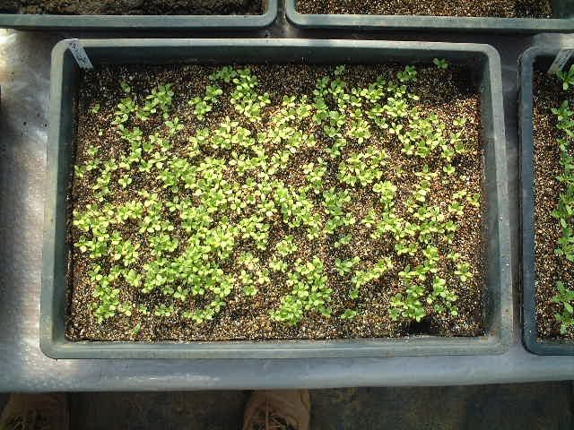 これは2週間前に種をまいたダイアンサス(なでしこ)で、F1テルスターという品種。この品種は生育旺盛で草姿も良く作り易い。この育苗箱に約500本の苗が入っている。あと10日位で本葉5〜6枚になったら9センチポリポットへ鉢上げする。追肥は週に一度液体肥料を施す。 |