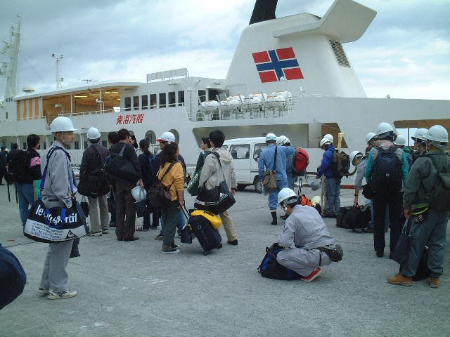 東京から神津島に着き、ヘルメットとガスマスクを受け取り、はまゆう丸に乗り換え三宅島に向かう。工事関係者、行政関係など結構多くの人が渡る。 |