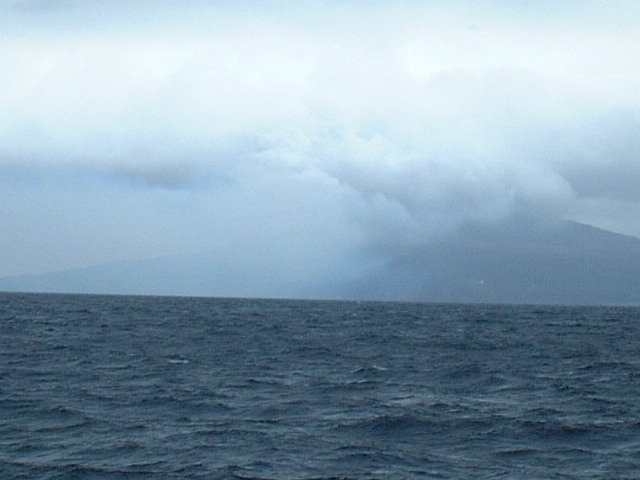 三宅島錆ヶ浜港に向かう。火山ガスで青白く島が霞んでいた。モクモクと出る水蒸気と棚引く大量の火山ガスを見ると厳しい現状が実感される。 |