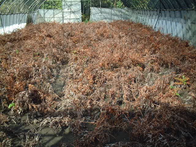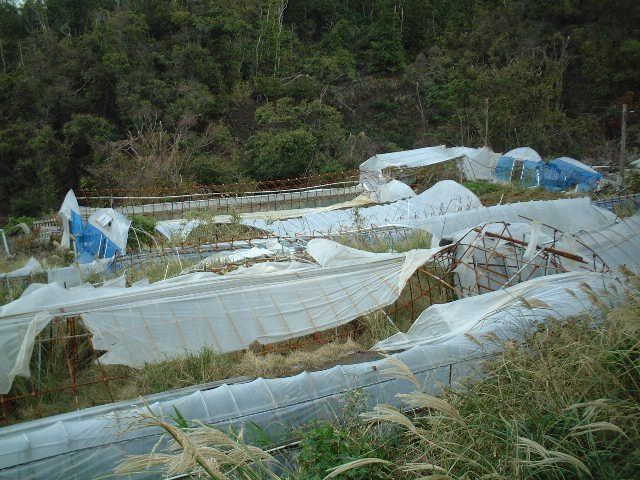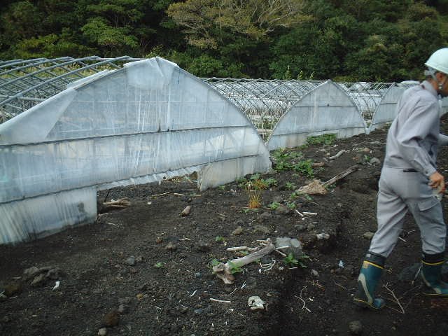 坪田地区以外の地区は、火山ガスの影響だろうが、ハウスのパイプが腐食し殆ど使用不能状態。帰島後は撤去、新設しなくてはならないだろう。 |