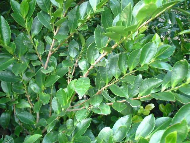 「サカキ」も火山ガスの影響が見られず元気が良い。杉や園芸作物にくらべもとから自生している植物はガスにも強いようだ。 |