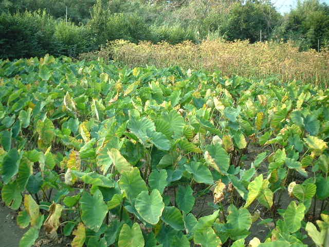 「サトイモ」は昨年の小芋が育っているが、降灰やガスの影響だろうか、地区によって種芋に使えるところと種芋にも使えないところとがあった。 |