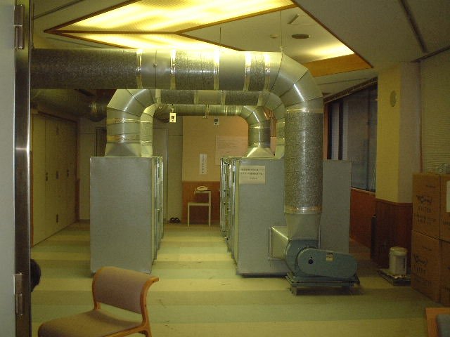 農業委員会一行は村役場のクリーンルームに宿泊。火山ガスが来た時は、この脱硫装置が稼動する。視察中もSO2が5ppmになり、一時クリーンルームに避難。 |