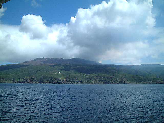 5日朝5時30分、三宅地区住民約180人、錆ヶ浜港着。東の風で白煙が流れてきていましたが、火山ガスは検知されないとのことでガスマスクは使用しませんでした。西側から見る三宅島は、雄山の上半分は荒涼とした枯れ木と火山灰の様相ですが山麓から海岸線までは以前の緑が復活しており、島での生活再開の希望を抱かせてくれるような眺めでした。 |