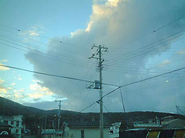 11時50分、東京に向け出港。手前に流れている白煙(後ろの白いのは雲)の下に青白く見えるのが二酸化イオウのガスです。