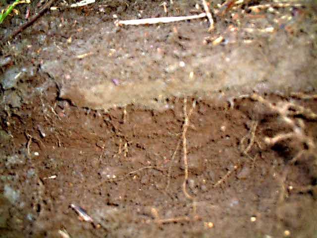 ピンボケで見にくいですが畑土の断面です。下の茶色い土が元の畑土で上の灰色っぽいのが火山灰です。真中の少し色合いの違うところが堆積している火山灰の断面です。 |