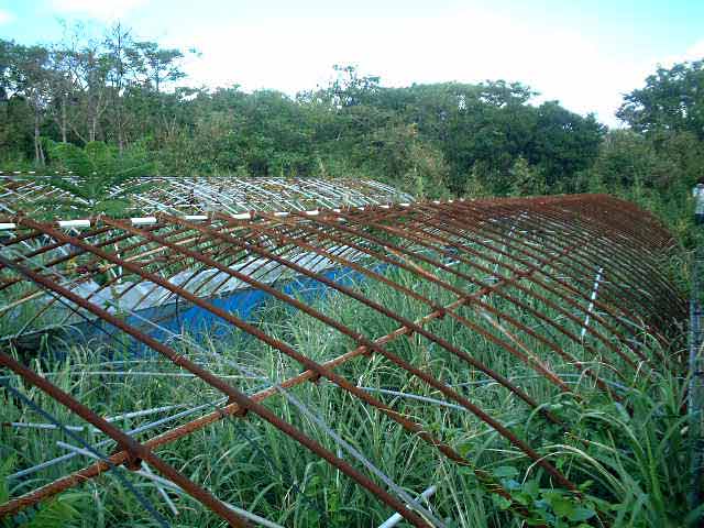 レザーファン(切葉用のシダ)を植えてあったハウスも枯れて完全になくなり、カヤとマグサがびっしりと生えていました。これらは年々株が大きくなっていき抜根作業が大変になっていくでしょう。18棟のハウスパイプも完全に錆びていて帰島後には全て撤去しなければなりません。農地復旧、パイプハウスの撤去、新設、、、自己資金での再建は難しいです。 |