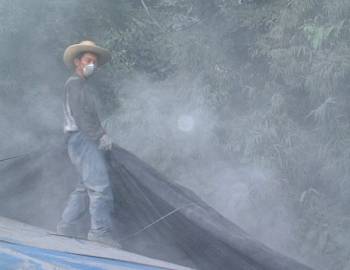 炎天下凄まじい灰埃のなか、ハウスの屋根の火山灰を落としてゆくのは大変な作業だ。高齢の農家には過酷すぎる。